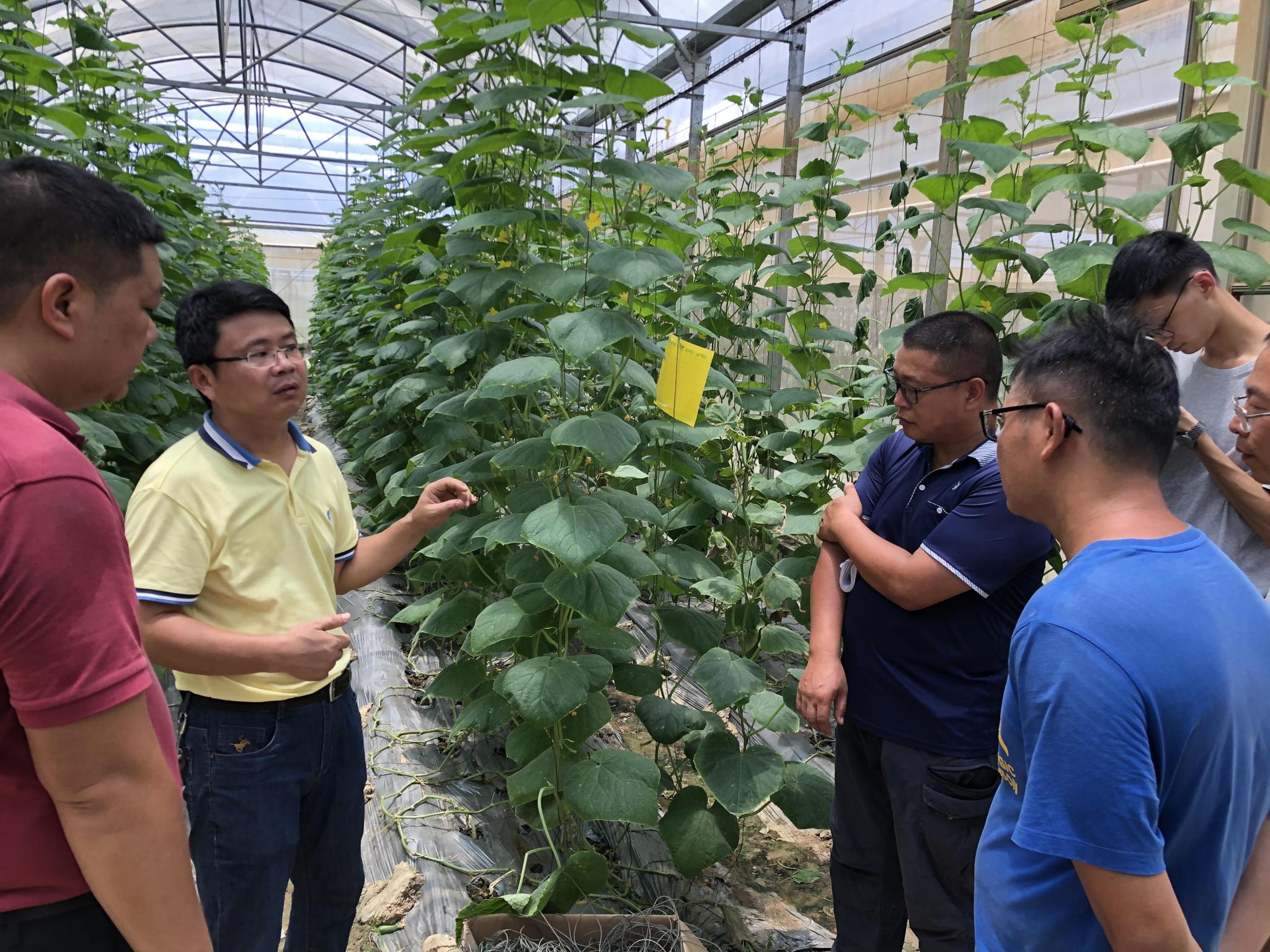 7月15日,服务团队早早来到了阳江智慧农业科技有限公司,在莫铁军先生与企业技术人员的带领下深入细致地考察了智慧农场的各个种植区。在此过程中,喻国辉教授将课堂搬到了田间地头,一方面指出企业在种植管理上存在的细节问题,一方面考察学生的基础知识,让同学们通过实践去认识田间的病虫害。同行的孙昀皓副教授和李春季副教授均有着丰富的微生物科研经验,针对种植区内病害鉴定与防治方法提出了独特见解,借助周围的植物病害材料为学生们上了生动的一课。