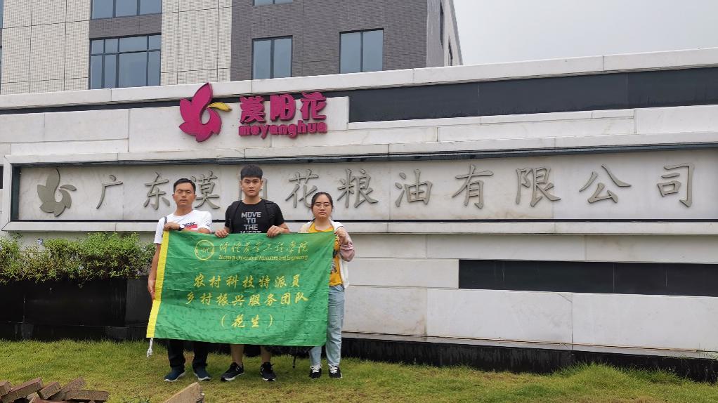 为积极响应《广东省乡村振兴科技计划》号召,落实省、市、校服务“三农”总体工作部署,2020年8月6日~7日,m88 app乡村振兴花生产业服务团队与“三下乡”大学生乡村振兴服务队一行5人,在花生产业服务队队长崔华威老师带领下,到阳江市漠阳花粮油种植有限公司调研,团队受到了公司总经理程禹满等人热烈欢迎。