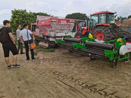 最后,服务队跟随程禹满总经理来到公司占地近460亩的徐赤花生种植基地参观。程经理为服务队介绍了各种现代化花生与水稻整地、播种、收获机械,以及使用过程对机械做的技术改进。双方还就企业助农、农户闲置土地流转等问题进行了深入交流。