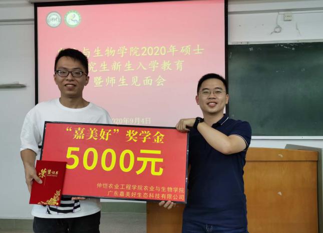 会上对学院2020级优秀研究生新生给予表彰和颁发奖学金。在“嘉美好”奖学金颁奖仪式上,学院副院长周玲艳宣读表彰决定,由学院党总支书记陈丹雄和广东嘉美好生态科技有限公司副总经理方佳煜颁发荣誉证书和奖学金5000元。