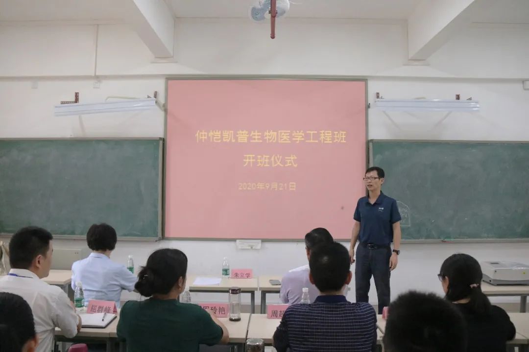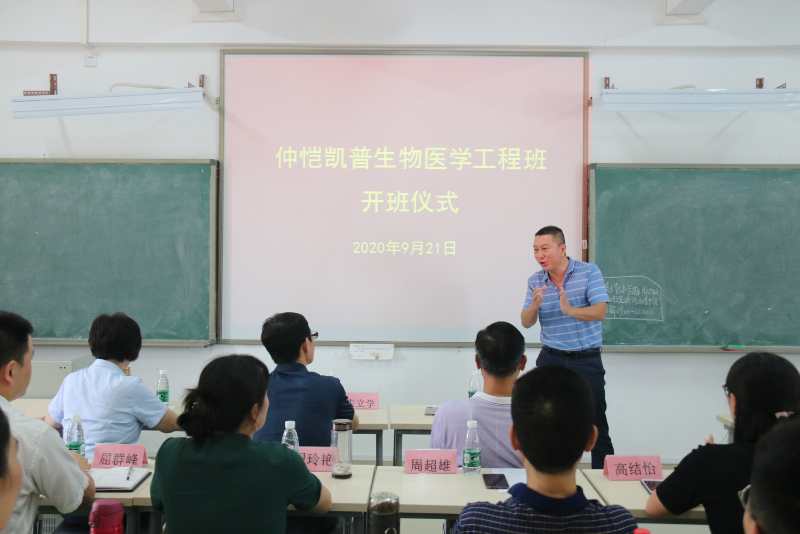 朱立学副校长对仲恺凯普生物医学工程班的同学提出了三点希望:一是要把开班仪式作为一个新起点,把个人学习与产业应用紧密结合,同时与“真实 朴实 求实 踏实”的人才培养宗旨结合起来,发扬仲恺学子的优良作风;二是要注重创新。不仅要能传承知识,还要会创造知识,凯普公司是一个创新型企业,同学们要借助这一平台提高自己的创新能力;三是要注重回报社会。通过产学融合培养模式,培养出有技术能力、高尚理想的生物技术人才,同学们要有社会责任心,把技术和能力回馈社会。