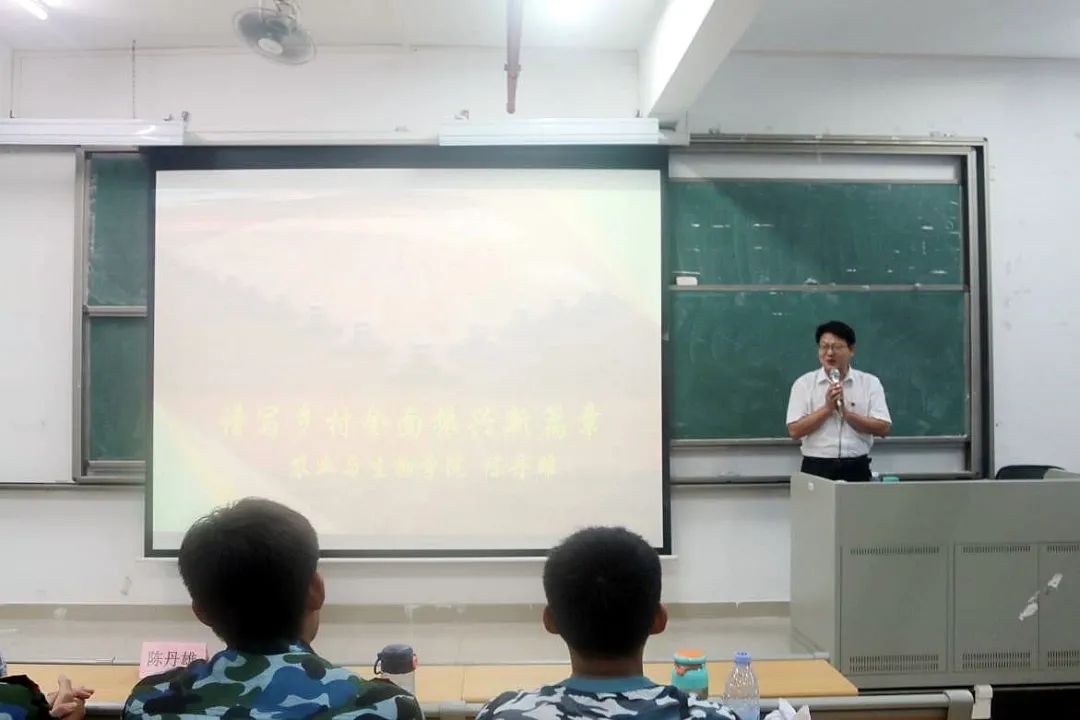 课堂上陈丹雄指出,当代中国正逐步向农业农村现代化迈进,国家重视乡村振兴工作的落实与执行,同时从中华民族伟大复兴战略全局来看,民族要复兴,乡村必振兴,加快完善乡村建设与解决乡村发展过程中尚且存在的短板问题,显得刻不容缓。此外,他还指出,全面实施乡村振兴战略的深度、广度和难度都不亚于脱贫攻坚,他希望新生们能够意识到三农问题的重要性,能明白乡村建设发展的不易,同时能够重视好自己的专业,学好学透自己的专业知识。此外,他在会议上也向同学们介绍了许多“十三五”期间在乡村振兴方面取得的伟大成就,以及m88 app优秀干部扎根基层,为乡村振兴事业贡献自我的事例,以此来勉励新生们要坚定自己的理想信念,逐步完善自身,为乡村事业的发展贡献出自己的力量。
