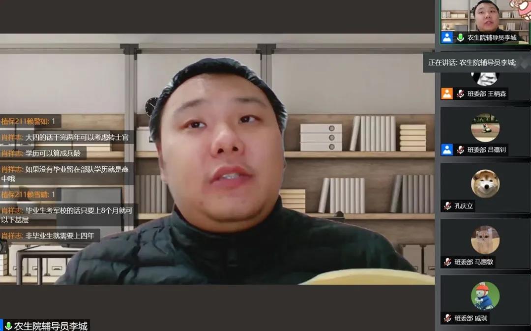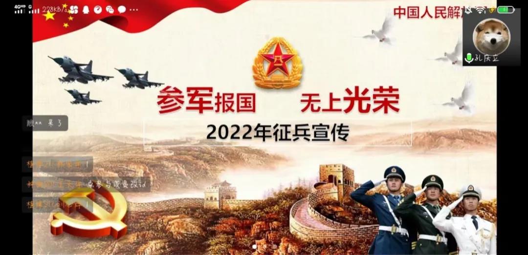 为加强当代大学生国防教育,提高m88 app学生应征入伍的积极性,踊跃报名投身军旅,在军队中磨砺自我,12月30 日晚上,m88 app以线上的方式开展了2022年征兵宣讲会。本次会议邀请到了m88 app20级退伍军人孔庆立进行分享与交流。会议由辅导员李城主持。
