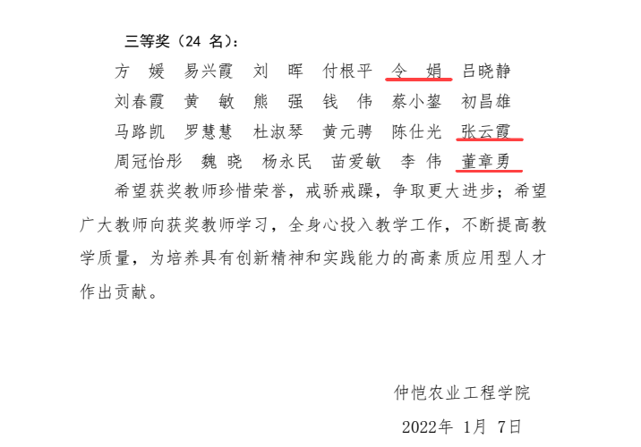 经各院(部)评审推荐、教务处审核、教学指导委员会审议、公示等程序,m88 app陈青春荣获一等奖,刘季平、孙伟、孙辉荣获二等奖,令娟,张云霞,董章勇荣获三等奖。