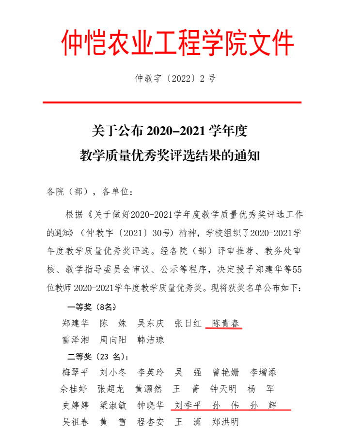根据《关于做好2020-2021学年度教学质量优秀奖评选工作的通知》(仲教字〔2021)30号)精神,学校组织了2020-2021学年度教学质量优秀奖评选。