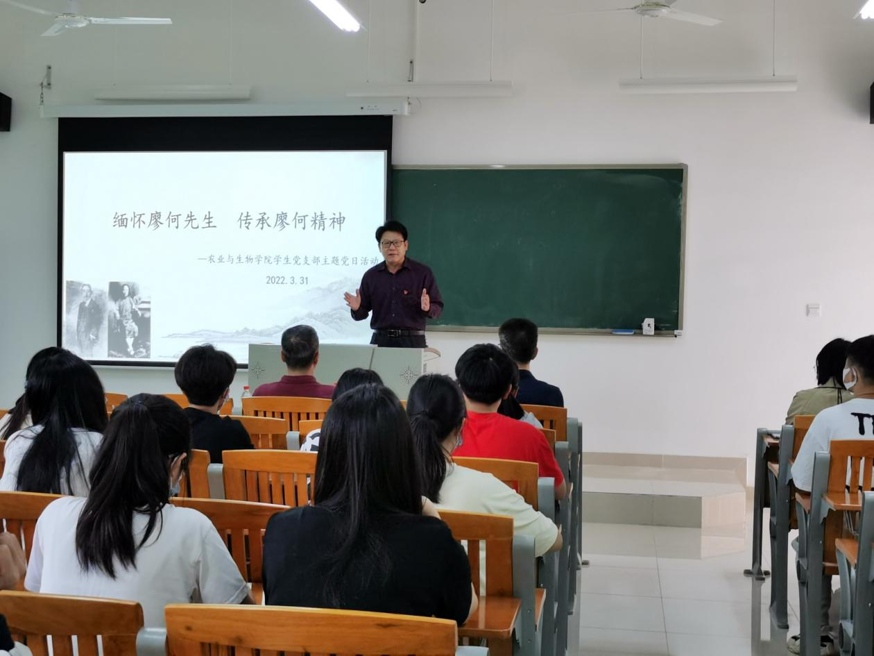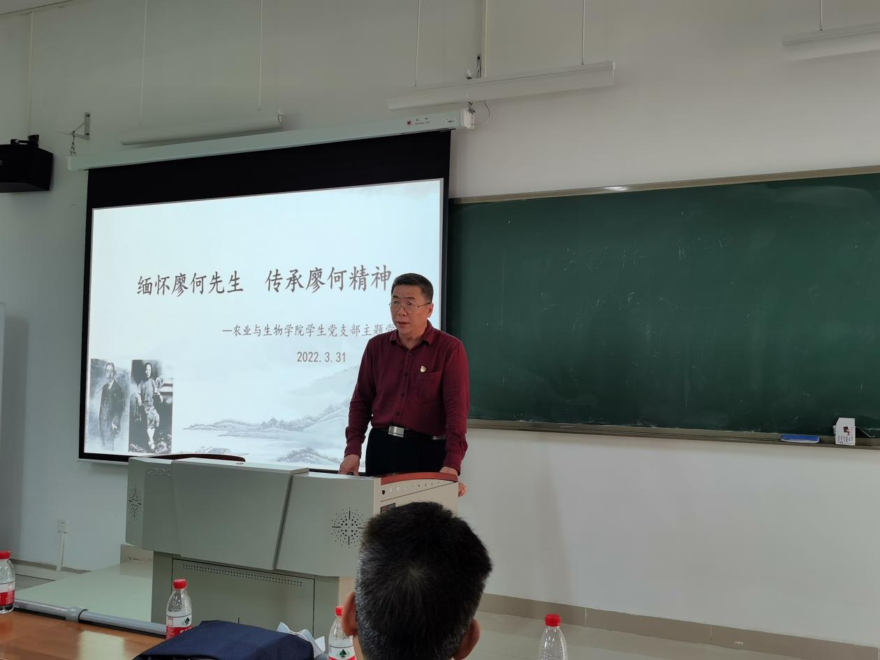 在建校九十五周年之际,为缅怀廖仲恺与何香凝先生,进一步传承廖何精神,3月31日,m88 app于生命科学大楼A座501室召开以“缅怀廖何先生,传承廖何精神”为主题的党日活动,参与本次党日活动的有校党委委员、纪委副书记、纪检监察室主任刘兵,m88 app党委书记陈丹雄,党委副书记周超雄,学院辅导员,学生党支部成员及各班优秀入党积极分子代表,会议由周超雄主持。