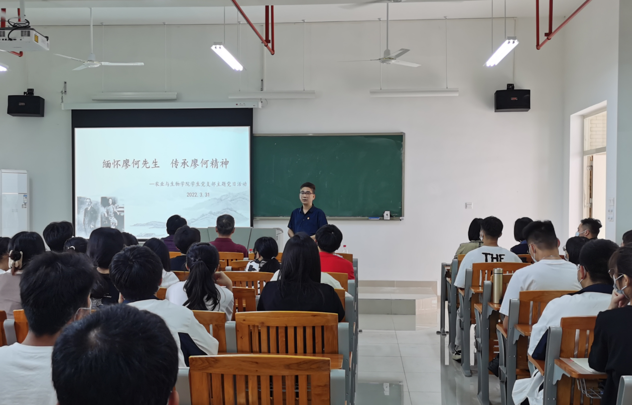 陈丹雄发言希望同学们学习廖何精神,铭记校训。作为农生学子要对自己的专业有认同感与自豪感,脚踏实地,不畏艰险,攻坚克难,同时积极投身于社会各领域,成为对国家、对民族有贡献的人。强调仲园学子应切实做到:一是知史爱校,做传承光辉校史的仲园人。应深入了解仲园的发展历史和光辉岁月,感受革命伟人的历史功绩和文化情怀。二是行动建校,做投身校园建设的仲园人。要关心学校发展,维护学校声誉,投身校园建设,明确爱校是责任,更是义务。三是奋斗荣校,做新时代奋进的仲园人。同学们要永远怀揣“注重实践,扶助农工”之志,用优异的专业成绩、优秀的道德素质、优良的处世作风,传承廖何精神,铸就学校辉煌。