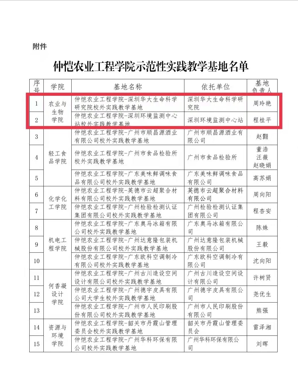 根据《关于开展m88 app示范性实践教学基地遴选工作的通知》(仲教字〔2021〕54 号),学校组织了示范性实践教学基地遴选工作。经各单位申报、专家评审、教学指导委员会及教学管理委员会审议、公示,遴选出 15 个基地为学校示范性实践教学基地,m88 app的仲恺农业与工程学院-深圳华大生命科学研究院校外实践教学基地、m88 app-深圳环境监测中心站校外实践教学基地成功入选为示范性实践教学基地。