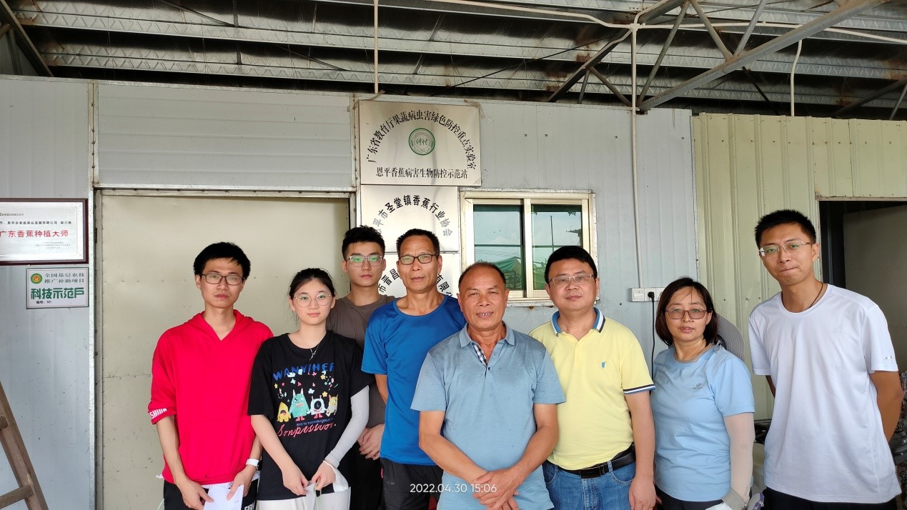 不误农时,助力春耕,趁着疫情得到有效控制和五一假期,m88 app植物健康创新研究院执行副院长喻国辉教授及其团队成员一行于2022年4月30日到恩平市开展苹果粉和巴西蕉病害发生情况调查和春耕生产指导。恩平市圣堂镇及其周边的乡镇大规模栽培国家主推品种粉杂1号的时间较久,因长期连作,导致鞘腐病发生严重。植物健康创新研究院从2020年开始在圣堂镇的2家合作社和1家种植公司设定固定观测点,并在2021年将该地设为广东省普通高校果蔬病虫害绿色防控重点实验室的生物防控示范站。