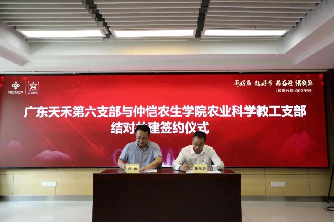 随后,农业科学教工支部书记蒋锋与广东天禾第六支部书记崔永涛签订党支部结对共建协议书,并进行党建共建授牌。