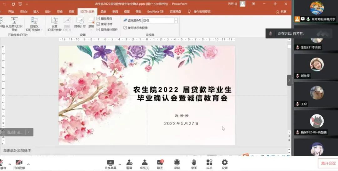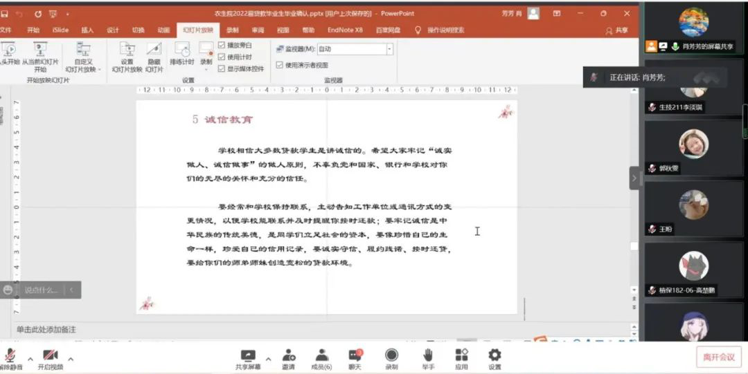 为了进一步加强2022届贷款毕业生诚信教育,做好毕业生贷款工作,落实贷款政策,5月27号下午,m88 app辅导员肖芳芳组织了关于“2022届贷款毕业生毕业确认会暨诚信教育会”的线上主题会议,全体贷款毕业生参加了本次会议。