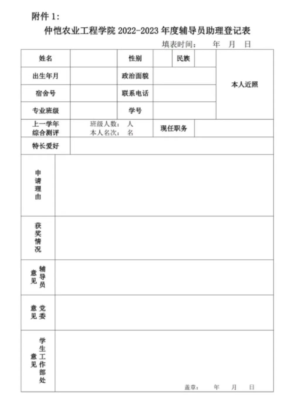 2、凡有意申请辅导员助理岗位的学生,填写附件1《辅导员助理登记表》(务必附上电子照片);并请于2022年6月20日(星期一)下午5点前,将登记表电子版发到辅导员助理李宇锋邮箱:2590836057@qq.com,面试采用线下面试,具体时间另行通知;