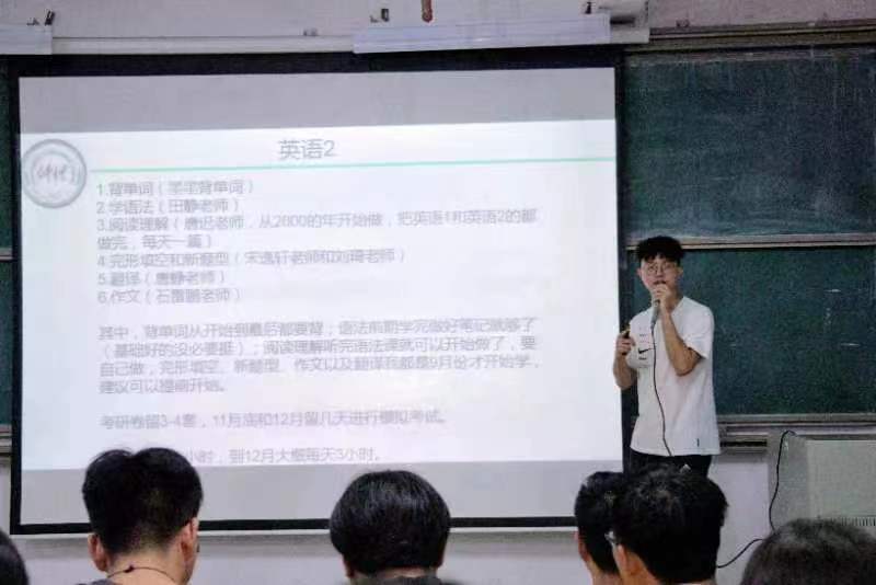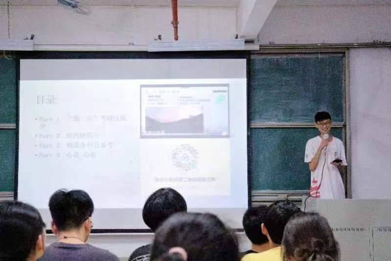 紧接着,陈炜伦(录取院校为华南农业大学—植物病理学)从考研政治和英语复习两方面作出经验分享。首先,在英语方面,他认为要注重词汇的积累和作文的练习,强调英语学习是个长期的过程,后期还需要做题以保持题感;接着,在政治方面,他主张要做笔记和背诵,重复地去记忆知识点;最后,他推荐了一些有用的公众号,并希望同学们能脚踏实地,放平心态,相信自己,做到劳逸结合。