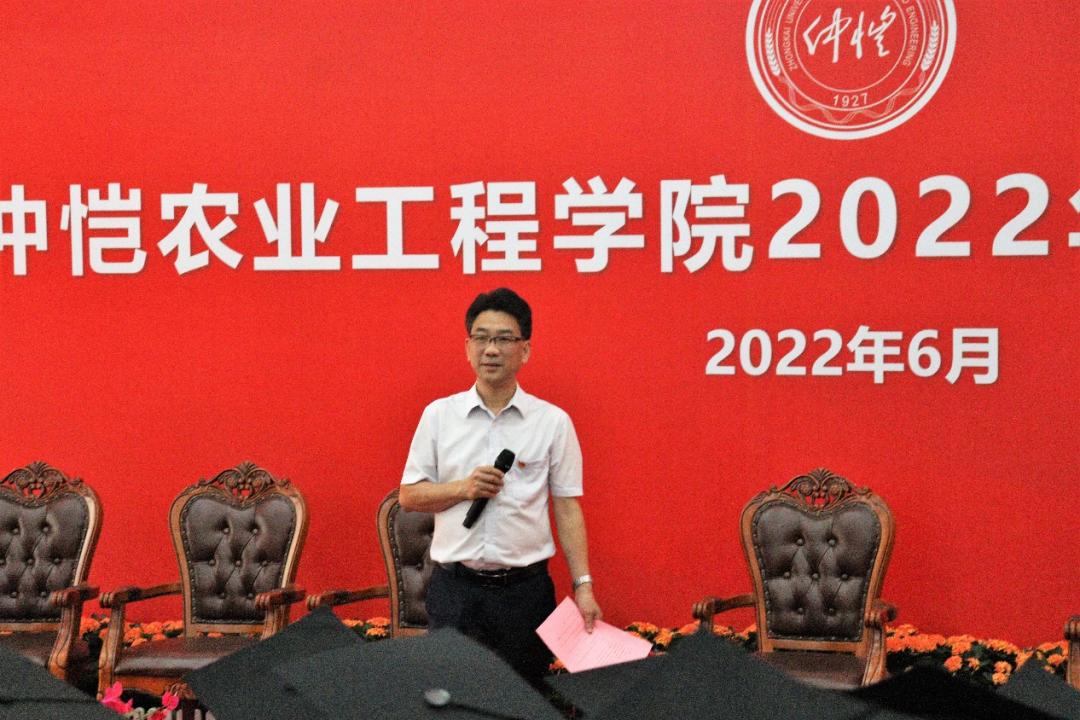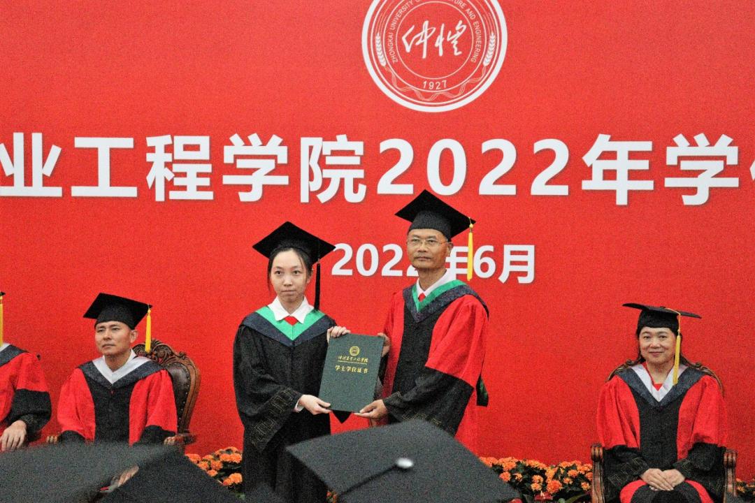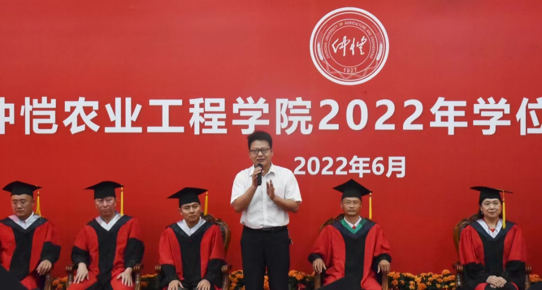 随后,毕业典礼在雄壮激昂的国歌声中拉开帷幕,在热烈的掌声中,陈丹雄致辞。陈丹雄对毕业生们提出三点深情寄语。一是此去需怀报国志,勿忘春风化雨情。一千多个日日夜夜,从懵懂大一到学有所成的现在,离不开学校与学院老师的栽培,每一届学子都应该继承“忆恩知报,饮水思源”的精神;农行天下,生生不息。二是勤奋牢记心间,天道酬勤方正道。大学毕业是一个阶段性的句号,是迎接新征程的开始;一劳永逸是童话,长期“作战”才是现实;生命不会总是春天,勇敢面对才有柳暗花明的明天。三是四年师友昨日成追忆,千里之行今朝正启航。红日东升,其道大光,同学们犹如潜龙腾渊、乳虎啸谷,锐不可当。正当青春进行时,同学们应以信念之铁锤,锻造理想之箭,引勤奋之弓,射向云水青天之间。