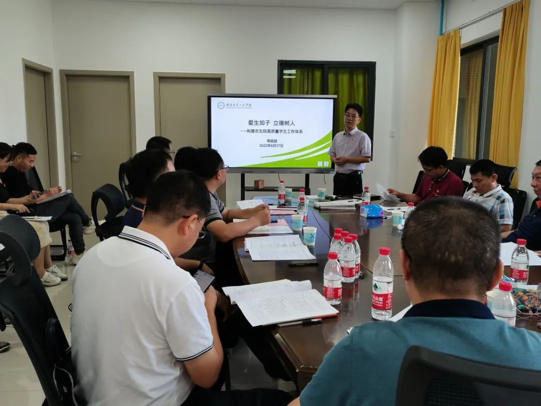 党委副书记周超雄以《爱生如子,立德树人——构建农生院高质量m88 app体系》为主题作报告,主要从形势背景与责任担当、工作情况与存在不足、体系构建与工作展望三个方面展开阐述。他再次强调了“以立德树人为根本,以强农兴农为己任”的农业高校教师的责任担当,并且举例说明了立德树人的育人成果及现实意义,让与会人员更加清晰地了解教育工作者的使命与担当。