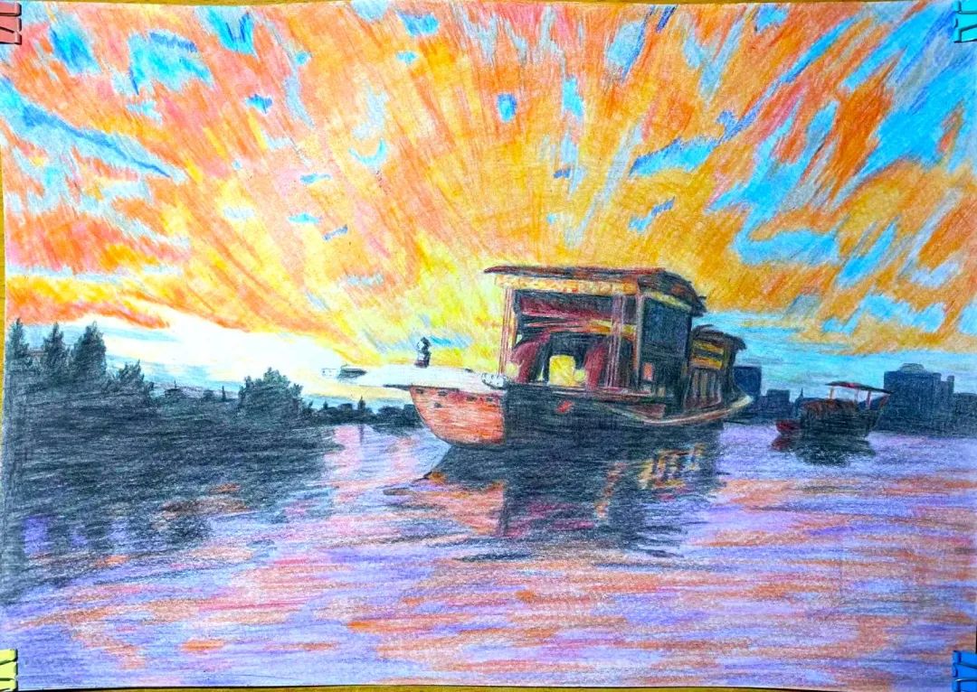 此画以联系当下时事,回望历史,不忘初心为创作动机,描绘出嘉兴南湖夕阳西下的落日美景——落日余晖普照大地,为大地带来光明,嘉兴南湖湖面广阔收纳着日落时天空独有的五彩晚霞。该画作通过鲜明的色彩进行视觉冲击,旨在提现"江山如此多娇"以及“夕阳无限好”所带来的希望与憧憬。其中红船作为点睛之笔,寓意深长且耐人寻味。