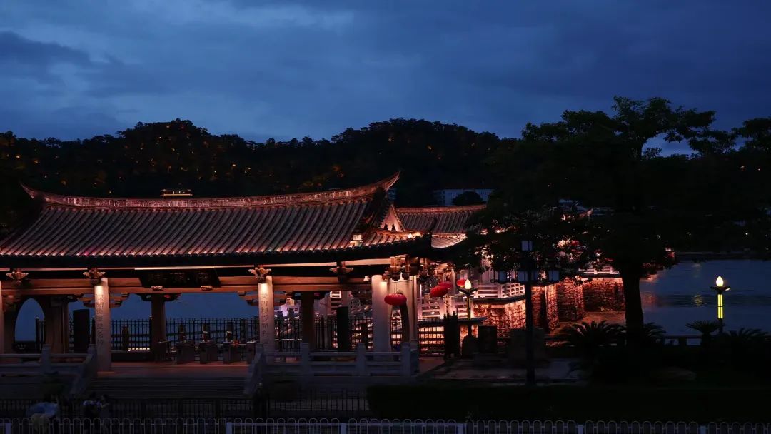 初到潮州,必会到达广济桥一游,而恰逢台风天,广济桥横跨在翻滚着滚滚波涛的韩江上,只有夜幕降临才稍微缓和。借着桥上的灯光和洒下的一点月光,早已闭客的广济桥像浮萍一样安静地漂在水面上,配上后方美丽的金山,让都市中的人们扫去一身的疲惫得到放松,驻目欣赏这壮丽迷人的风景。