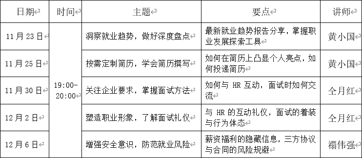 为了更好地帮助学生正确认识自身,从容应对企业招聘,顺利进入职场,拿到满意Offer,由m88 app,m88 app联合校外就业指导专业导师及企业高管,开设系统的、全面的、有针对性的线上就业指导活动月,进行就业全方位的系统训练,帮助大学生了解就业趋势,调整就业心态,掌握简历制作技巧和面试技巧,并熟悉面试礼仪,增强就业安全意识,从而全面提升求职面试技巧和方法,直面未来,顺利就业。具体安排如下: