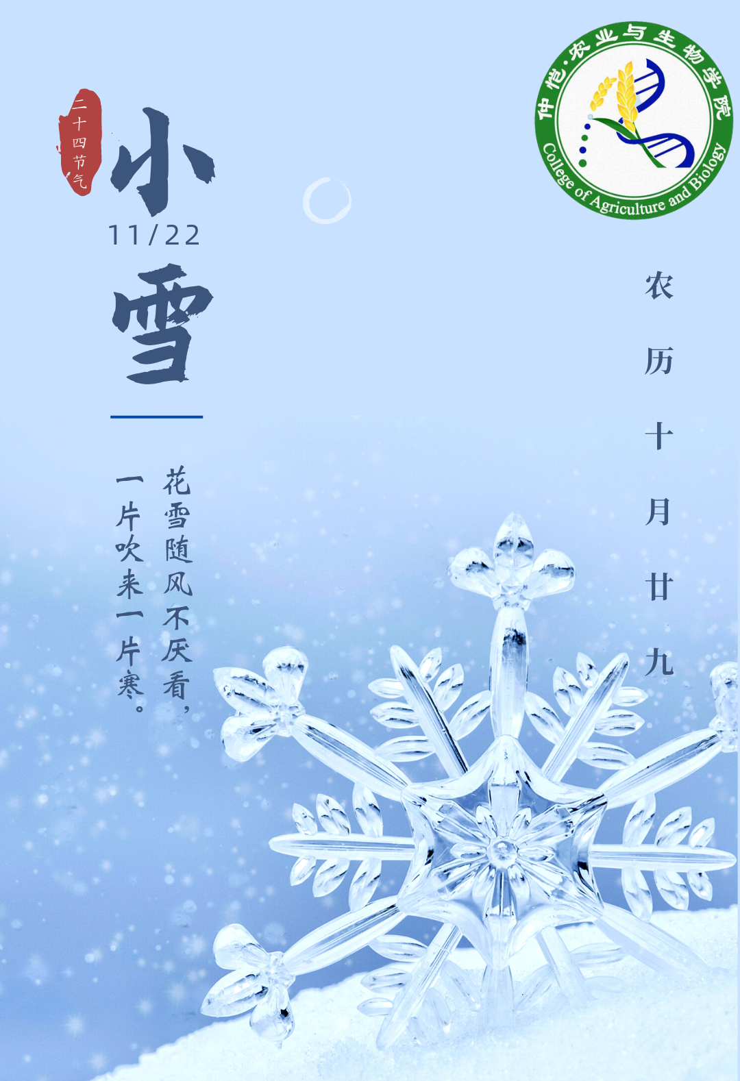 小雪,是二十四节气中的第20个节气,冬季第2个节气,时间在每年公历11月22或23日,即太阳到达黄经240°时。《孝经纬》说:“后十五日,斗指亥,为小雪。”天地积阴,温则为雨,寒则为雪。时言小者,寒未深而雪未大也。小雪是反映降水与气温的节气,它是寒潮和强冷空气活动频数较高的节气,与天气的小雪无必然联系。小雪节气的到来,意味着天气会越来越冷、降水量渐增。