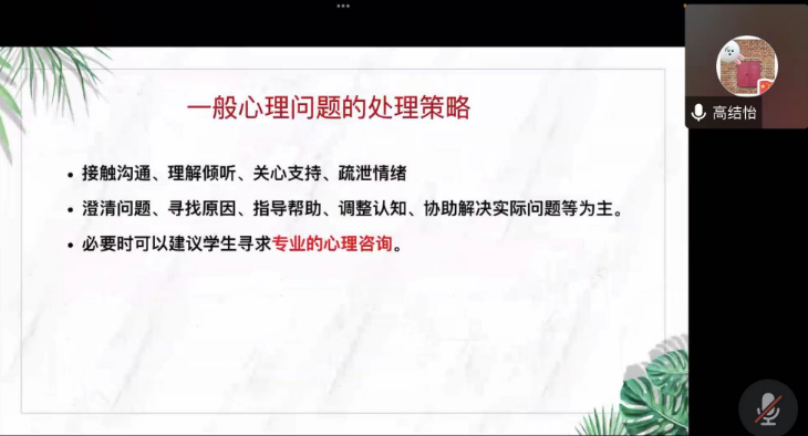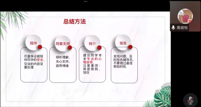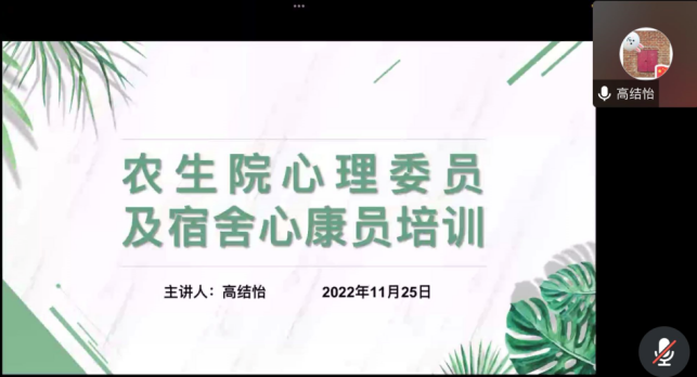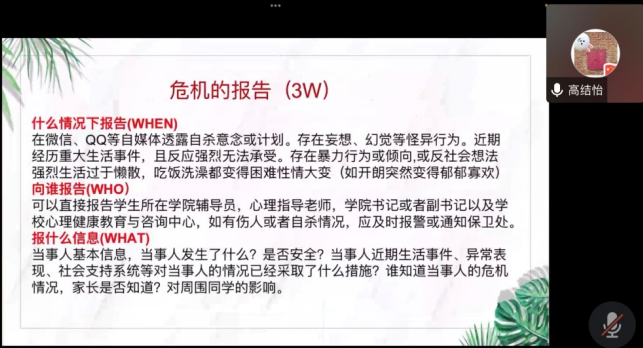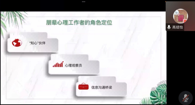 为了进一步加强学院学生心理健康教育工作,提高各班级心理委员以及宿舍长心理健康知识水平,11月25日下午,m88 app于腾讯会议召开心理委员及宿舍心康员培训会议,学院各班级心理委员及宿舍长参加了本次培训,培训由辅导员高结怡主讲。