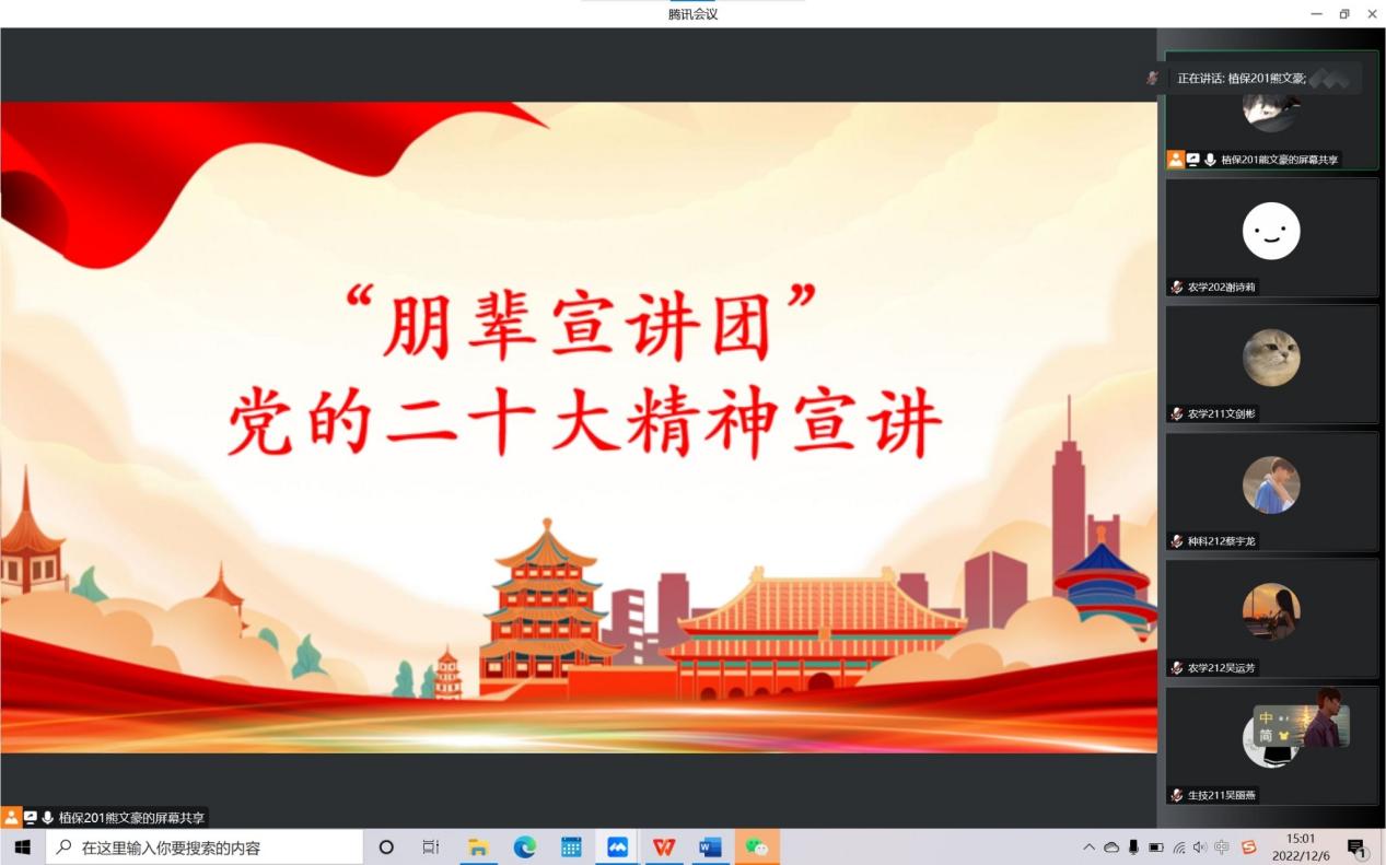 为全面贯彻习近平新时代中国特色社会主义思想,弘扬伟大建党精神,提高同学们的政治素养,学习、宣传、贯彻党的二十大精神,12月6日下午,m88 app以线上会议的形式进行了党的二十大精神宣讲会议。出席本次会议的有m88 app“学习贯彻宣传党的二十大精神青年宣讲团”成员李城,m88 app学生会主席团成员熊文豪、融媒体中心主任谢诗莉和2021级全体同学。