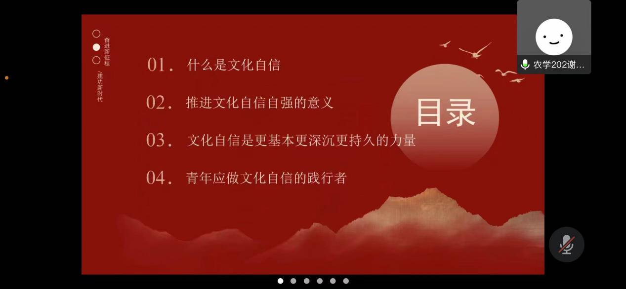 最后,谢诗莉围绕“文化自信”向同学们分享了文化自信于当代青年的意义。她表示,当代青年只有树立了坚定的文化自信,才能自觉抵制不良思想和社会风气的侵蚀,才能正确把握个人发展与国家发展的关系,将个人理想追求融入到党和国家的事业中来。