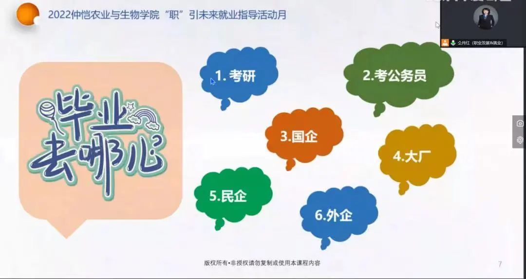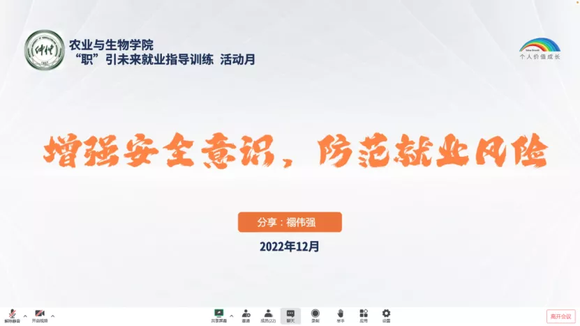 本次训练营活动的开展历时半个月,导师们从就业趋势、简历制作、企业需求、面试方法和就业安全意识等方面入手对学生进行就业辅导。使得同学们能在今后的社会生活中能够树立正确的就业观念,提升自身能力,从容面对未来的各项挑战,从而顺利就业。同学们也在此次活动中积极参与,踊跃发言讨论,展现了农生学子们浓烈的求知欲。