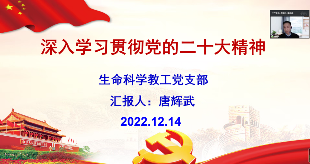根据党中央总体部署和学校相关要求,m88 app生命科学教工党支部于12月14日在线上召开全体党员大会,集体深入学习贯彻党的二十大精神。