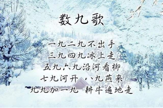在古代入九以后,有些文人、士大夫者流,搞所谓消寒活动,择一“九”日,相约九人饮酒,席上用九碟九碗,成桌者用“花九件”席,以取九九消寒之意。另外古人还创作了数九歌:一九、二九不出手;三九、四九冰上走;五九、六九,沿河杨柳;七九河开,八九雁来;九九加一九,耕牛遍地走。