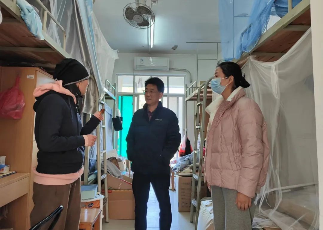 12月31日,周超雄书记、张金凤副书记一起走访学生宿舍,了解留校学生在校期间的学习生活以及离校时间,细致检查学生宿舍内务卫生和消防安全情况,叮嘱留校同学注意安全,保持良好的生活作息习惯,特别提醒同学们离校后“人走断电、关好门窗”,并送上新年问候和祝福。