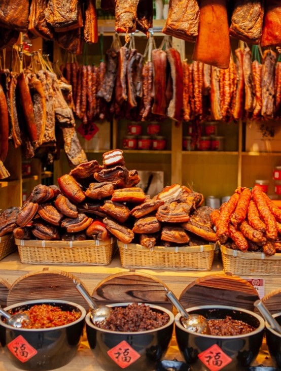 7.“腊味”,腊味在中国有悠久的历史。“腊”是一种肉类食物的处理方法,是指把肉类以盐或酱腌渍后,再放于通风处风干。早在《周礼》、《周易》中已有关于“肉甫”和“腊味”的记载。年尾十二月被称为“腊月”,这时的天气云量较少且少雨干燥,西北季候风开始流行,肉类不易变质且蚊虫不多,最适合风干制作腊味。腊月已近年,为过年腊制年肴。