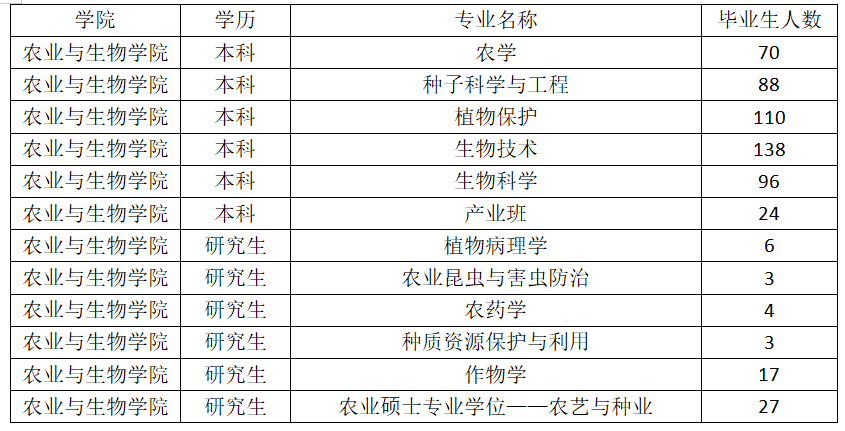 设有农学(含生物育种科学创新班)、种子科学与工程(含生物育种科学创新班、仲华基因科技产业创新班)、植物保护、生物技术(含生物育种科学创新班、仲华基因科技产业创新班)、生物科学(含生物科学类中新国际班)、中草药栽培与鉴定等6个本科专业。