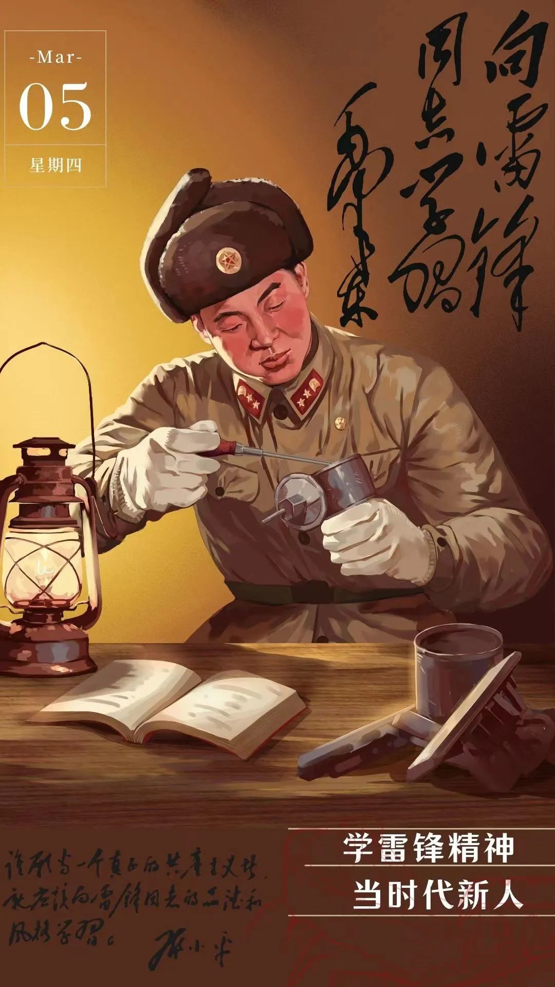 作品介绍:阳春三月,全国上下洋溢向雷锋精神学习好气象。雷锋“干一行、爱一行、钻一行、精一行”,甘愿在平凡工作岗位上做一颗永不生锈的螺丝钉,把自己的青春投入到全心全意为人民服务之中的高尚品德,不仅值得我们新时代青年弘扬与传承,还需要我们把这种精神带入到祖国的建设中去,方能早日实现中华民族的伟大复兴。本作品以简约的风格,阐述了伟大的雷锋精神。