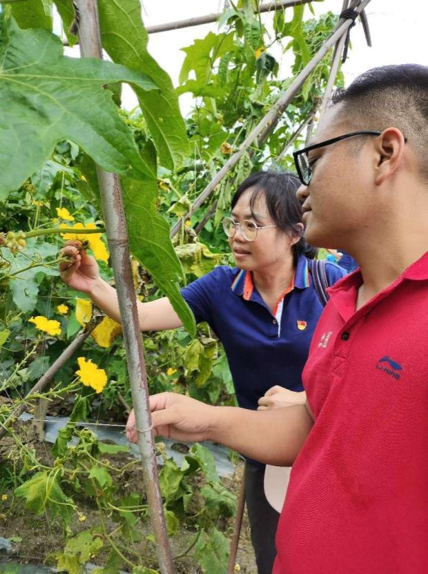 党员们在当地种植户带领下来到花东镇莲塘庄水瓜和苦瓜种植基地,深入田间地头,仔细察看水瓜的生长态势及病虫害情况,并针对当前瓜豆类蔬菜主要病虫害的防治用药情况进行详细了解。实地观摩结束后,农业科学教工党支部和广东天禾农资为种植户举办了培训会,植保专家颜珣教授为大家作《 蔬菜虫害绿色防控》专题讲座,主要介绍了蔬菜害虫种类以及综合防治方法;广东天禾农资冯德铨经理为农户们讲解了瓜豆类蔬菜病虫害用药解决方案,现场也详细解答了农户们在生产实践中遇到的问题。