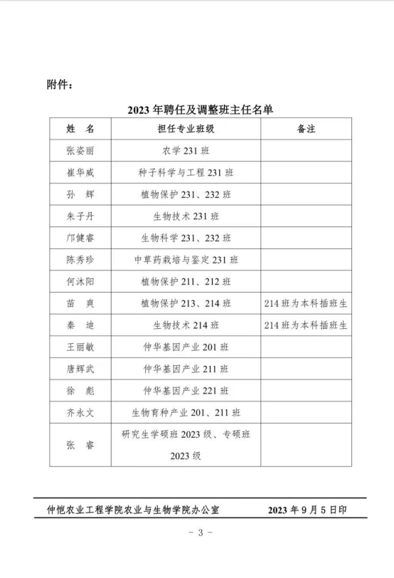 附:2023年班主任聘任名单,其中,张姿丽、崔华威、孙辉、朱子丹、邝健睿、陈秀珍分别担任农学、植保、种科、生技、生科与中草药专业的23级新生班主任。