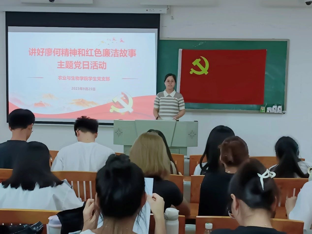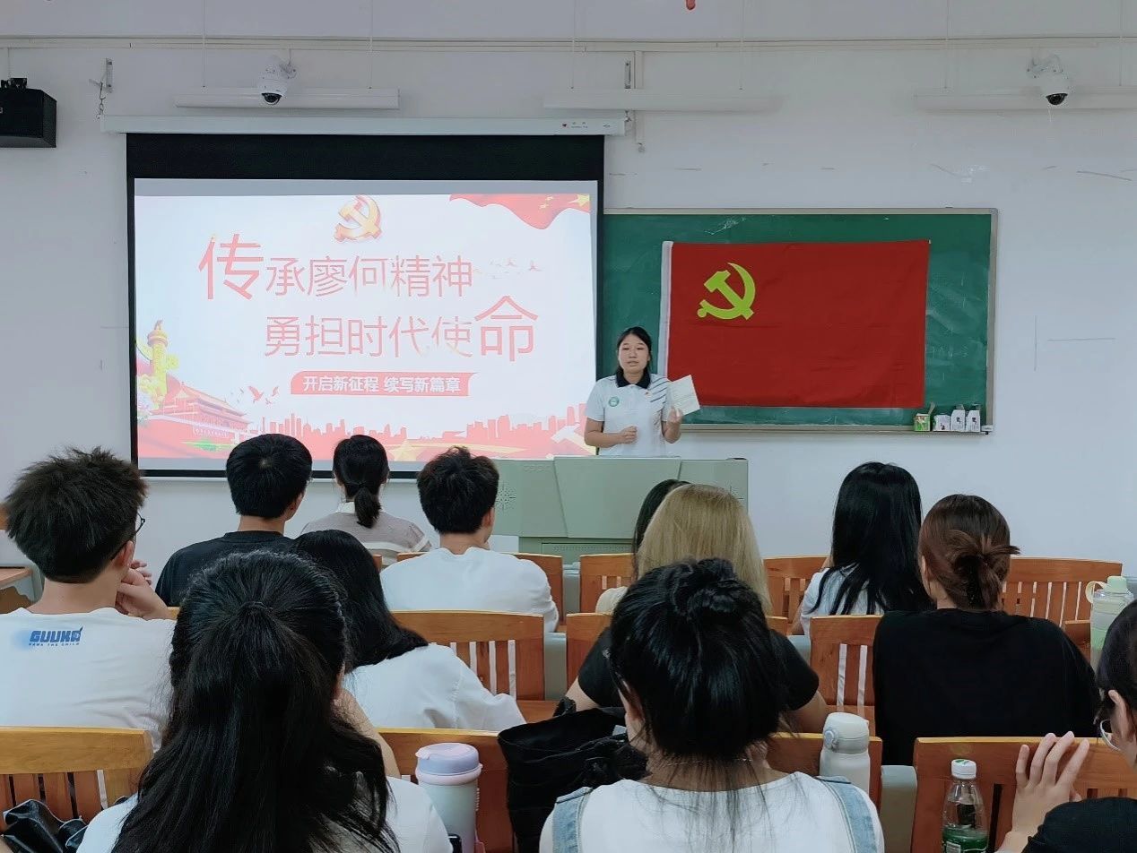 首先,由来自生命科学学生党支部的陆小红同志讲解廖何精神。陆小红介绍了“廖何精神”的精神内涵和传承“廖何精神”的使命担当,重点讲述了青年应当铭记何香凝廖仲恺的爱国事迹,传承廖何爱国精神,勇于担当,争做时代新人。她叮嘱同学们身处21世纪,应该勇担“知校、爱校、荣校”责任担当。