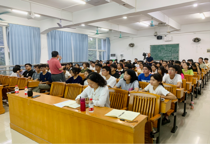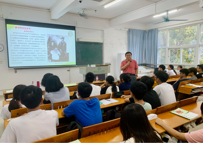 王明星教授主要围绕三个方面进行演讲,一是对“廖何”生平的介绍以及“廖何”文化的理解。王教授向大家讲述了廖仲恺先生与何香凝先生伟大的的生平事迹,为大家阐释了“廖何”精神的丰富内涵,让农生学子能更好地去学习和传承两位先生的爱国精神以及“注重实践,扶助农工”的校训精神。二是学校历史回顾和现状以及办学的定位和目标。王教授为大家详细介绍了仲恺的建校历史以及发展的过程与现状,并为同学们描绘了学校的未来发展目标与发展定位,他期望同学们能增强对学校的认同感,树立集体荣誉感,与学校“同呼吸、共命运”,一同为学校发展作出有应有贡献。三是“百千万工程高质量发展”政策与案例以及大学生的使命,王教授向大家解读了目前国内的“百千万工程高质量发展”政策,并列举了几项实例,他表示现如今的时代正是青年的时代,当代大学生肩负着推动新时代特色社会主义发展的使命。他寄语农生学子能够坚定理想信念、练就过硬本领、勇于开拓创新、矢志艰苦奋斗,在实现中华民族伟大复兴的历史进程中实现自己的价值。
