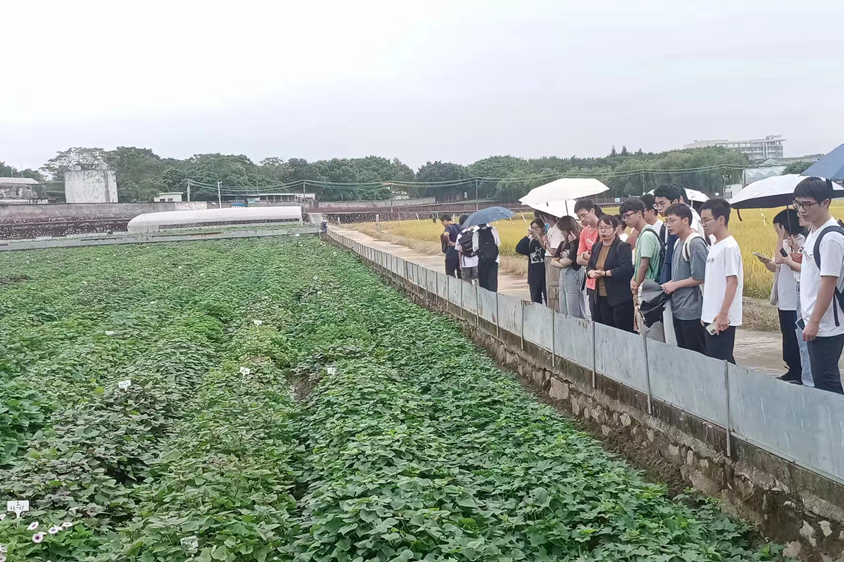 从广州种业之都展馆出来,孙伟老师和张姿丽老师带领同学们前往广东省农科院联合培养基地,参观水稻、玉米、甘薯和烟草等大田作物的种质资源圃及示范种植区。参观过程中,张姿丽老师详细介绍了水稻杂交育种的过程,孙伟老师分享了第一次“绿色革命”及抗倒伏水稻杂交育种过程。甘薯杂交后代鉴定的试验田旁,张老师介绍了不同甘薯种植资源的差异及特点,也谈到了甘薯新品种杂交选育的标准及脱毒快繁技术。烟草试验田中张老师讲解了杂交育种过程中系谱法选育自交系的过程以及材料编号的规则。在玉米国家区域试验基地旁,老师们介绍了玉米自交系及杂交种的区别,分析了杂种优势利用和育种目标制定,谈到了新品种选育及审定过程。