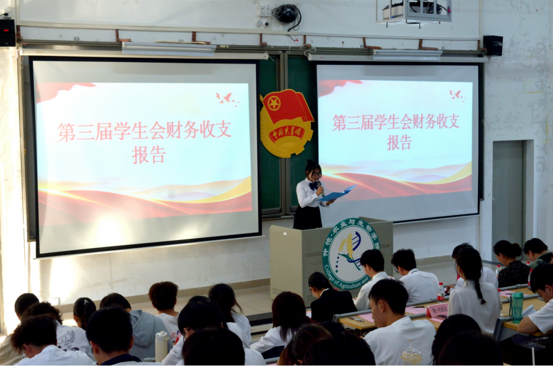 第三届学生会主席团成员熊文豪、杨桢熙就第三届委员会工作情况及财务收支情况进行汇报,并代表第三届学生会委员及学生会全体成员向帮助和关心学生会健康成长的学院各级党委组织和给予关心悉心指导的老师们致以崇高的敬意,向为学生会工作付出辛勤汗水的工作人员以及配合学生会工作的全体同学致以衷心的感谢。大会上选举产生了学生会第四届委员会委员5人,分别由吴依林、何梓君、张紫怡、曾锦茵、蔡宇龙(按姓氏笔画顺序)当选为新一届学生会委员会委员。