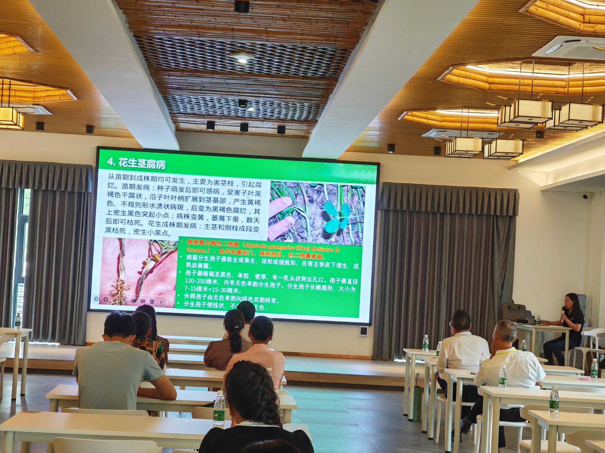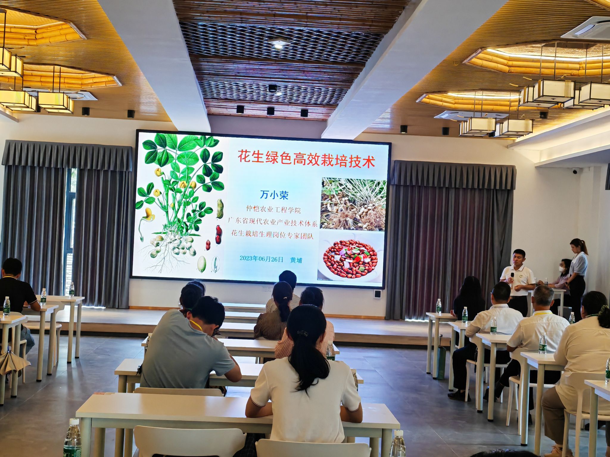 在花生技术培训和产业化研讨分场,万小荣教授、杨祁云研究员和王丛丛副研究员等专家分别作了技术培训讲座,授课专家们一一回答了代表们和农户的提问。省花生大豆产业技术体系栽培生理岗位专家、m88 app重点项目办主任万小荣教授讲授了《花生绿色高效栽培技术》,省花生大豆产业技术体系综合防控岗位专家、广东省农业科学院植物保护研究所杨祁云研究员讲授了《花生病虫害绿色防控关键技术》,省花生大豆产业技术体系农林复合岗位专家、广东省林业科学研究院副研究员王丛丛博士讲授了《花生病虫害绿色防控关键技术》。随后,代表们围绕花生产业化开发进行专题交流与研讨,寻找花生产业高质量发展新途径、新方法,探讨花生全产业链标准化建设及合作前景。