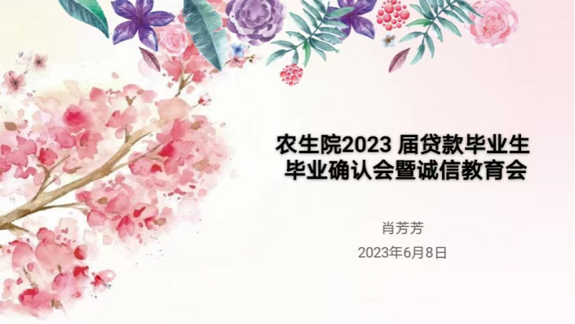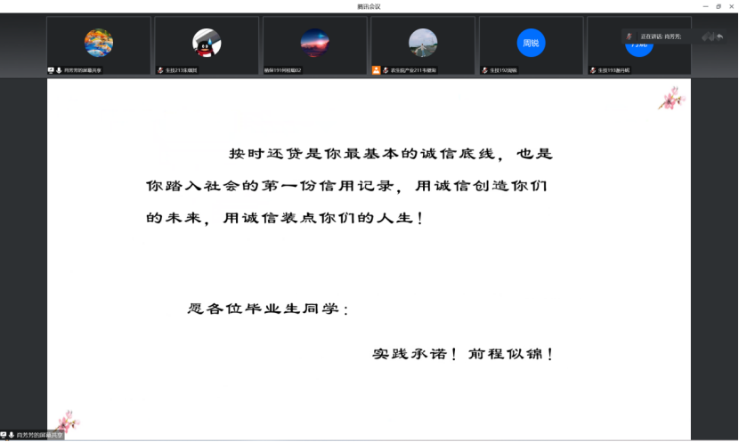 贯彻落实国家助学贷款相关政策,提高贷款毕业生的诚信还款意识,帮助贷款毕业生了解还款相关手续。6月8号下午,m88 app辅导员肖芳芳组织了关于“2023届贷款毕业生毕业确认会暨诚信教育会”的线上主题会议,全体贷款毕业生参加了本次会议。