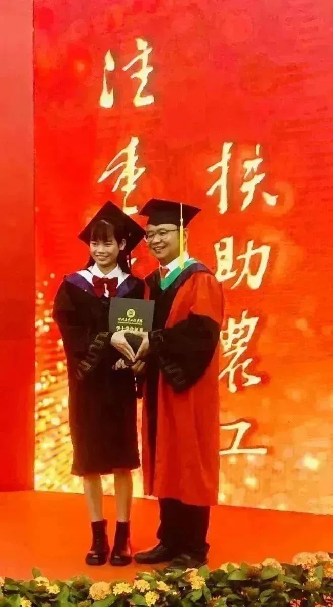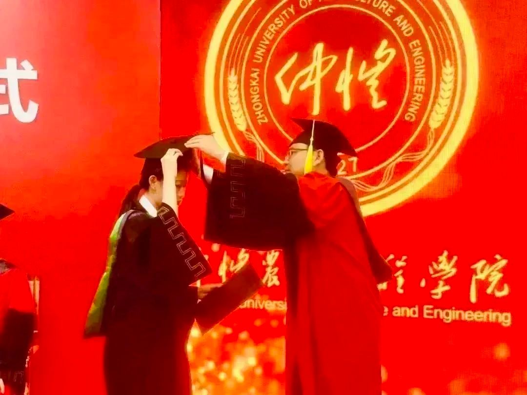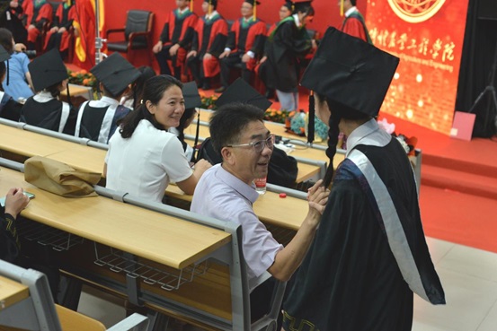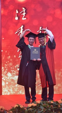 拨穗正冠是大学生毕业被授予学位的一项重要礼节,象征毕业生已学有所成,可以展翅高飞。廖明亲自为每位毕业生拨穗、颁发学位证书,与毕业生合影留念。