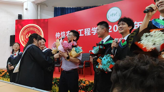 拨穗礼毕,毕业生们上前鲜花送给到场的领导和老师,每一朵鲜花都代表着毕业生们对导师们的深深感激和敬意,也寄托了他们对未来的美好憧憬和愿望。