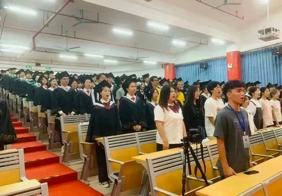 “深深地祝福你,最亲爱的朋友,祝你一路顺风……”周超雄和毕业生们合唱《祝你一路顺风》,动人的歌声里充满了祝福与不舍,把活动现场氛围推向了高潮。这首歌传递了学院老师们对同学们的祝福和鼓励,寄托了对毕业生们未来道路的美好期许。周超雄对学院全体毕业生表示热烈祝贺,希望他们能够铭记母校的恩泽,时刻谨遵老师们的教诲。他鼓励毕业生们要有坚定的信心,勇敢面对未来的挑战,并寄语他们在人生的新征程中一路顺风,希望他们能够披荆斩棘,勇往直前,追逐梦想的脚步永不停歇。