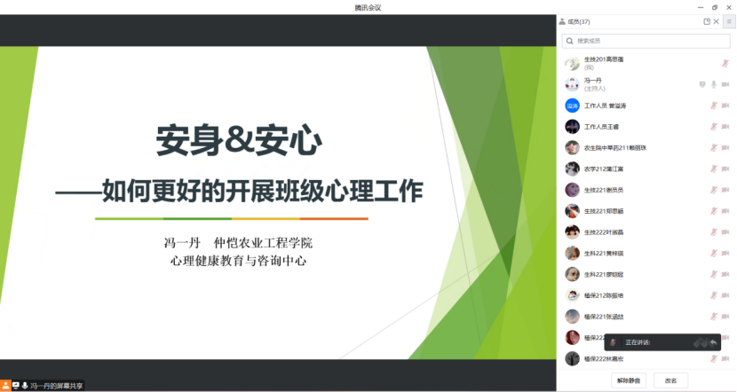 冯一丹老师以《安身与安心》为主题,就如何更好的开展班级心理工作做了专题讲座。她指出大学生心理问题大多数来源于家庭问题、学习或工作遇到挑战、日常人际沟通模式改变三个方面,其中重点指出家庭问题中父母夫妻关系是引起该问题的重要因素。还从认知、情绪、行为、身体四个方面向我们展示了心理失衡的可能表现。