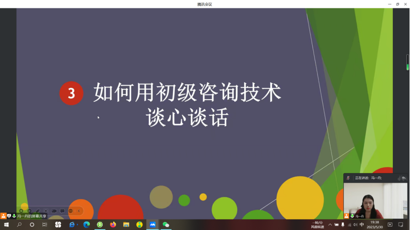 接着,冯老师从尊重、温暖、真诚、共情、积极关注五个方面教我们与同学进行谈心谈话。她重点点出温暖与热情的区别:二者都关注求助者的需求但不同于热情,温暖是柔柔的被理解、鼓励的感觉。