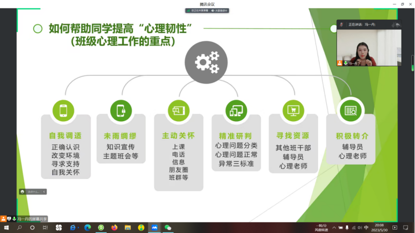 最后,冯老师强调提高“心理韧性”是做好班级心理工作的重点。各班可以从自我调适、主动关怀、精准研判三个方面入手。每个同学也可以以自我关怀的方式进行心理调节,如每天写下3件让自己平静或快乐的事等。