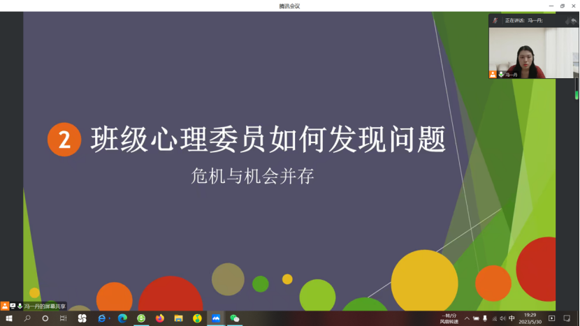 随后,冯老师详细讲述了班级心理委员如何发现问题。她指出微信朋友圈是一个寻找蛛丝马迹的好地方,因为危机中的人会发出求助信号,而这些信号就是我们救援的机会。她表示心理委员可以跟学习委员等其他班委合作从学习情况中发现问题,也可以与各个宿舍长合作从日常生活中发现问题。