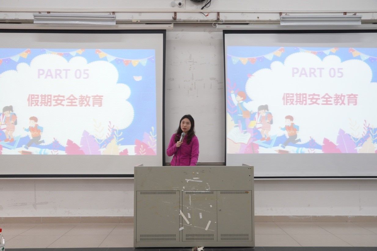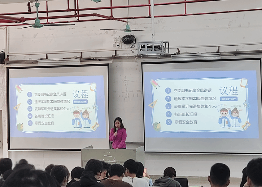 邝健睿从国防教育知识竞赛、学生手册考试、宿舍检查评分、早读缺勤通报、阳光晨跑活动、运动会组织参与以及各班集体和个人获奖统计等各方面情况展示了23级各班在本学期的整体表现。她充分肯定了同学们在本学期取得的各方面成绩,希望全年级各班要向表现优秀的班集体看齐,互相学习、取长补短、争先创优。她鼓励全体同学要积极参加学校各项文体活动、学科专业竞赛和社团实践项目,不断历练、积累经验,更好地丰富和充实自己的大学生活和人生体验。同时,要坚持晨跑和晨读,培养自律的良好习惯,加强运动和锻炼,以饱满的精神状态和健康的身体素质应对下学期的各项挑战。