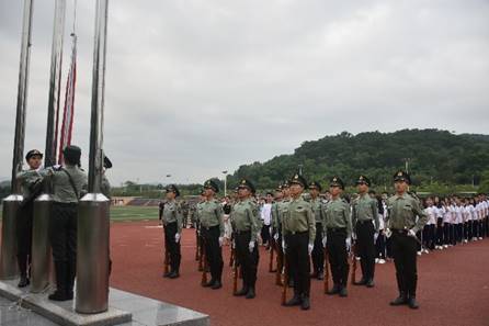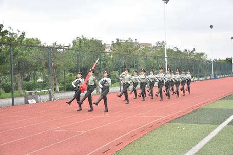 操场上,旗手们以整齐划一的脚步来到升旗台前,随着国歌奏起,五星红旗冉冉升起,老师、同学们迎着朝阳,向着国旗行注目礼。